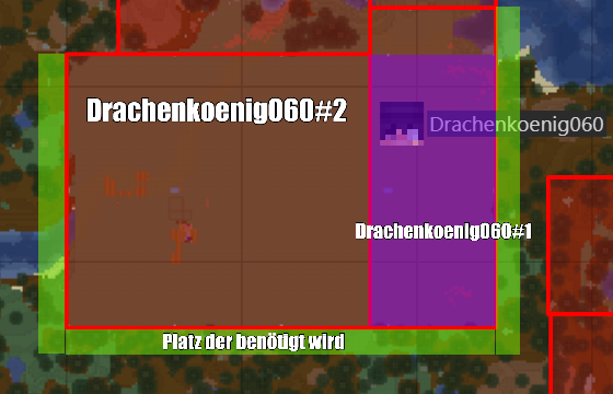 Ich plane ein Schloss mit Garten zu errichten und brauche dazu den bis jetzt vorhandenen Platz (rot) meines Grundstückes um dies zu verwirklichen. Um dies dann in die Umgebung einfügen zu können, benötige ich zu jeder Seite heraus weitere 6 Blöcke Bauplatz (grün markiert). Zudem wäre es schön, falls das im Bereich des Möglichen liegt, wenn man meine Erstzone in einem bestimmten Bereich (lila markiert) in meine Zweitzone verwandeln könnte.