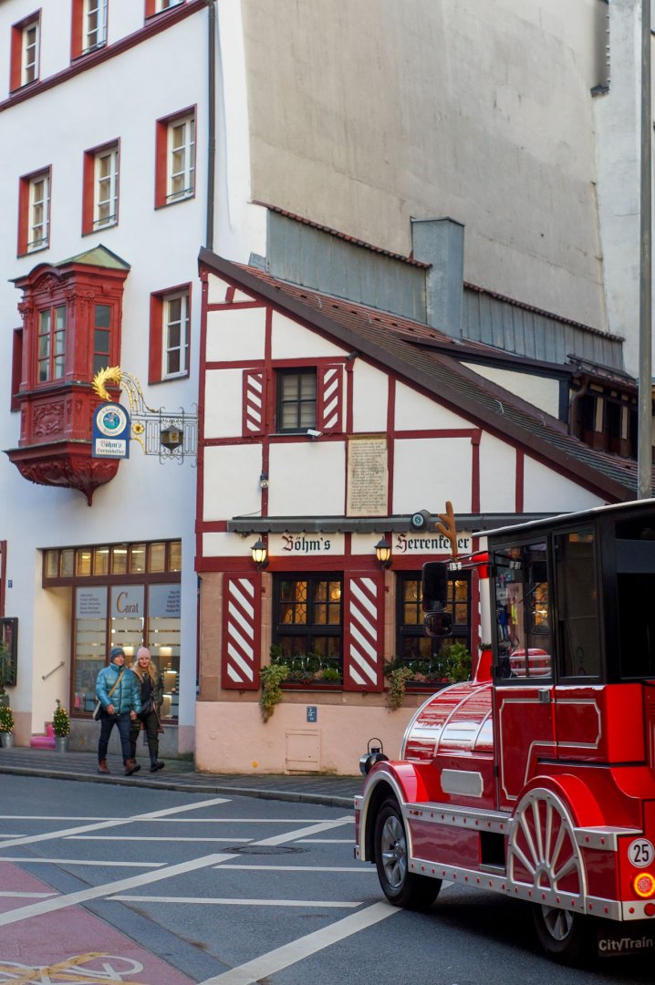 Die Stadtrundfahrt nimmt ihren Weg an Böhms Herrenkeller vorbei. Das Gebäude brannte im zweiten Weltkrieg teilweise ab und übrig blieb nur noch das Lokal im Erdgeschoss, das überdacht wurde und heute noch steht.