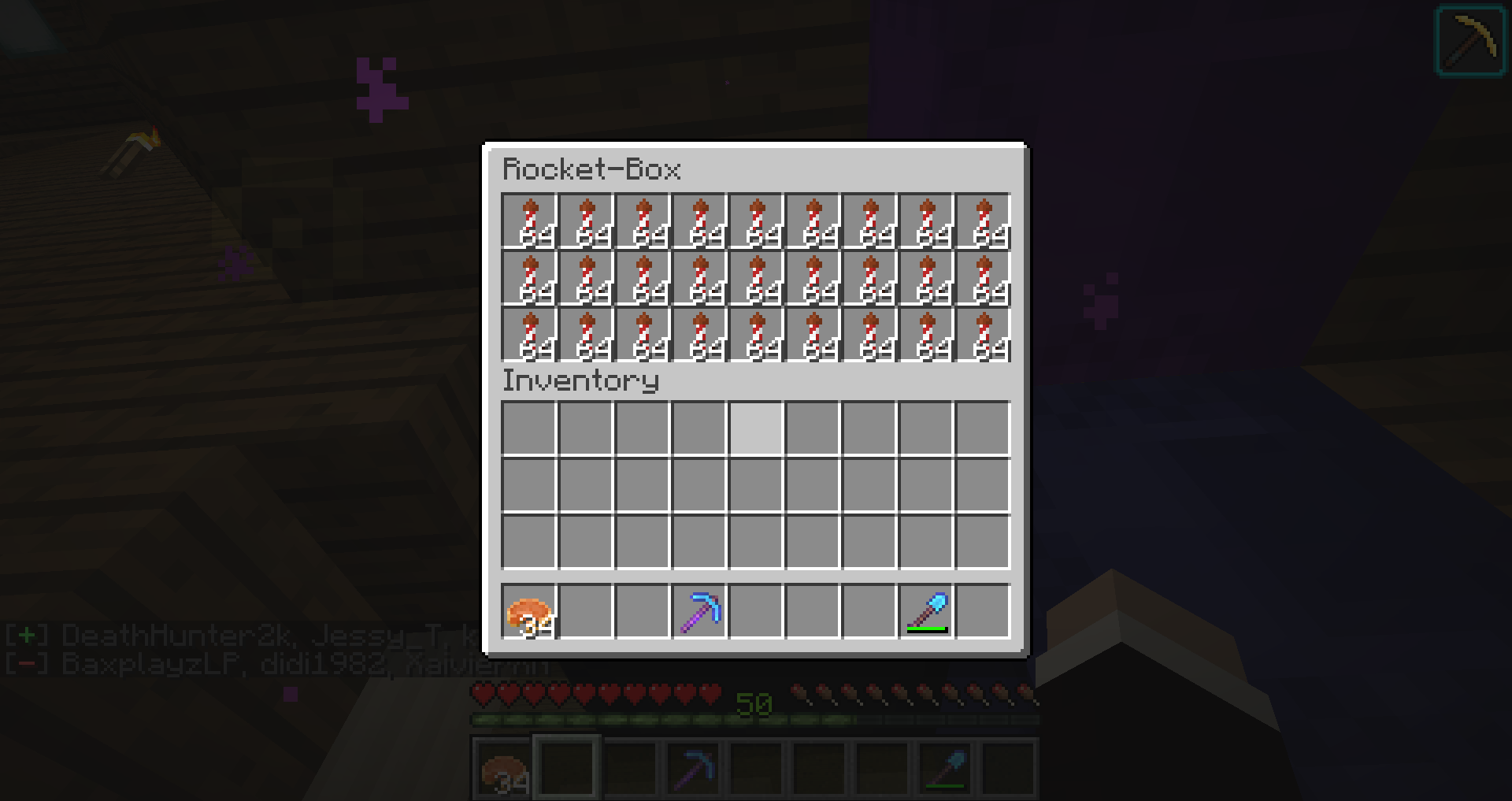 Dieses Mal möchte ich ein Starter-Kit für Leute mit Flügeln anbieten. Und zwar geht es heute um eine Shulker-Box gefüllt mit 27 Stacks Raketen mit Flugdauer 1.