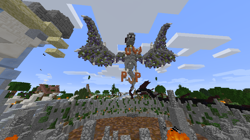 Ihr habt dort so viel raufgeklatscht, dass man förmlich erschlagen wird davon. Überall viele Köpfe, Laub, Köpfe, Teiche/Seen, Köpfe, Seerosen, Girlanden uvm. Ihr hättet euch vielleicht eher auf die Arena konzetrieren sollen. Darum geht es ja schließlich in dem Wettbewerb: Baue eine schöne PvP-Arena.